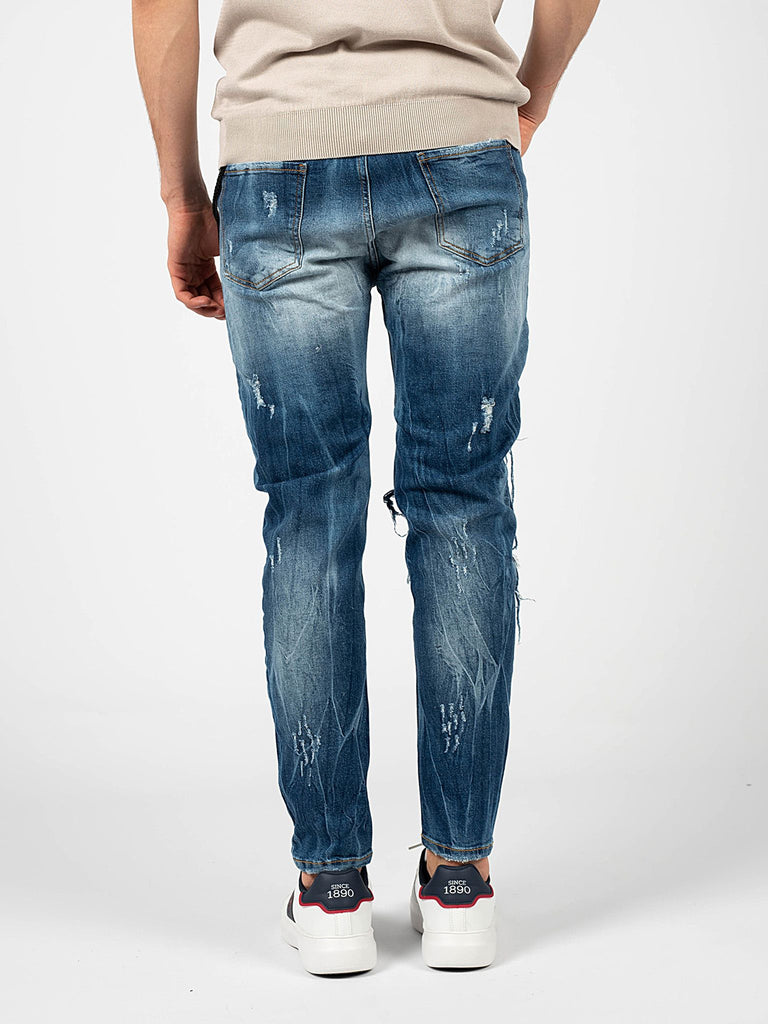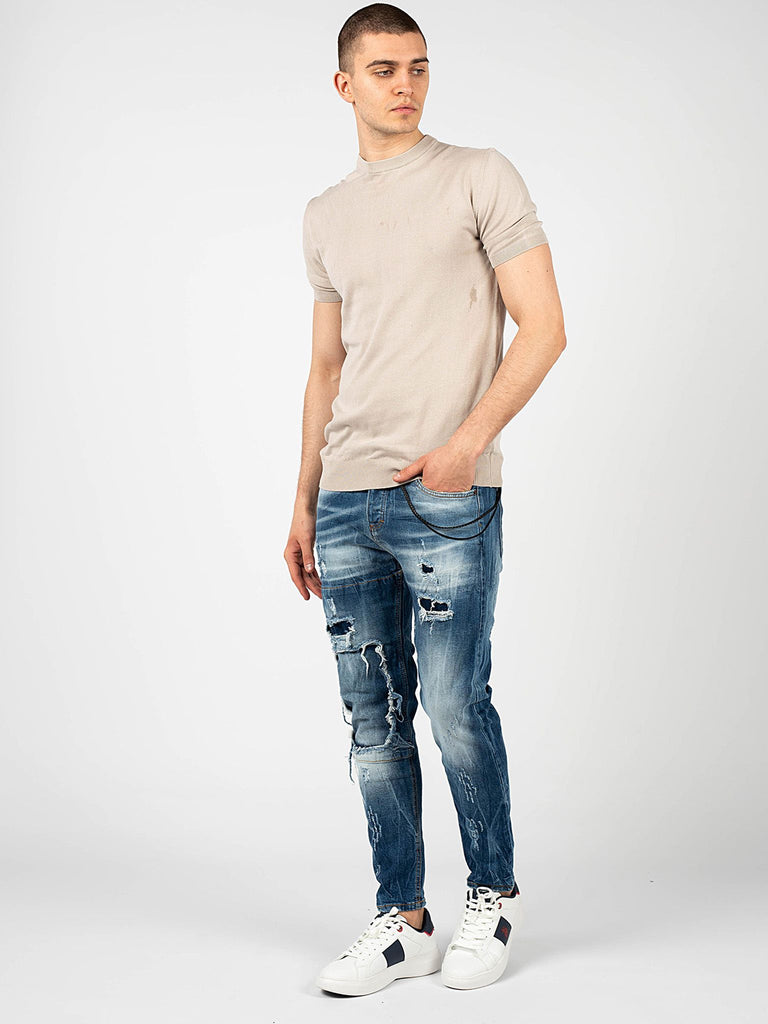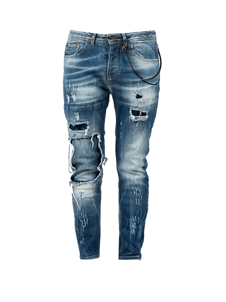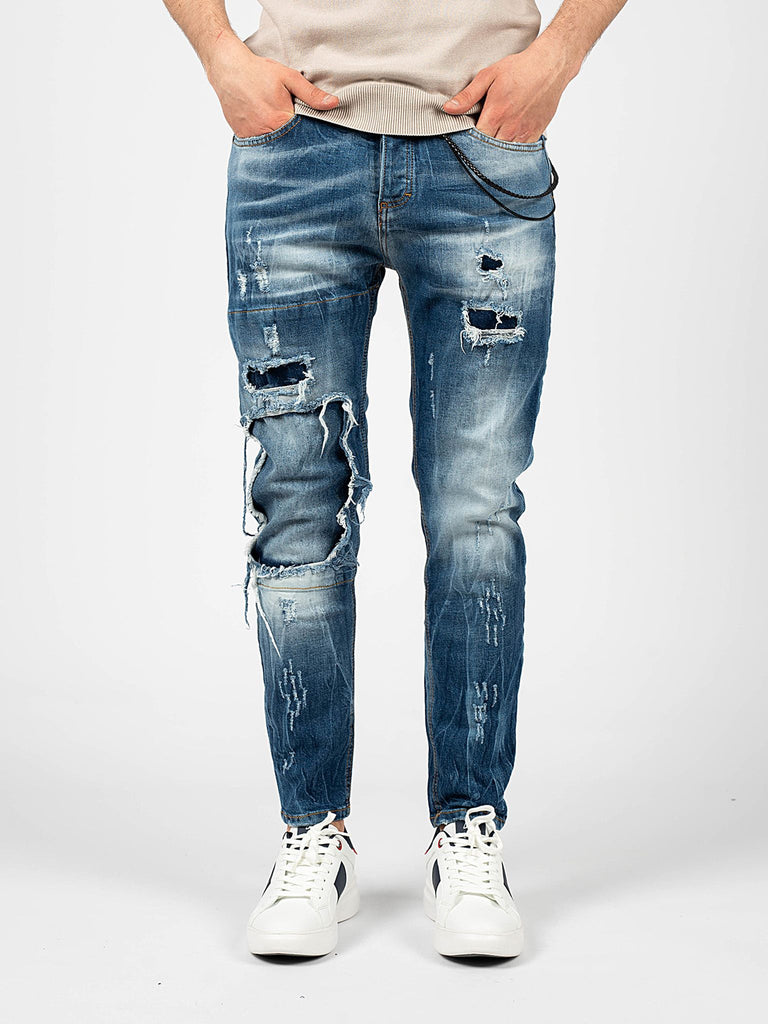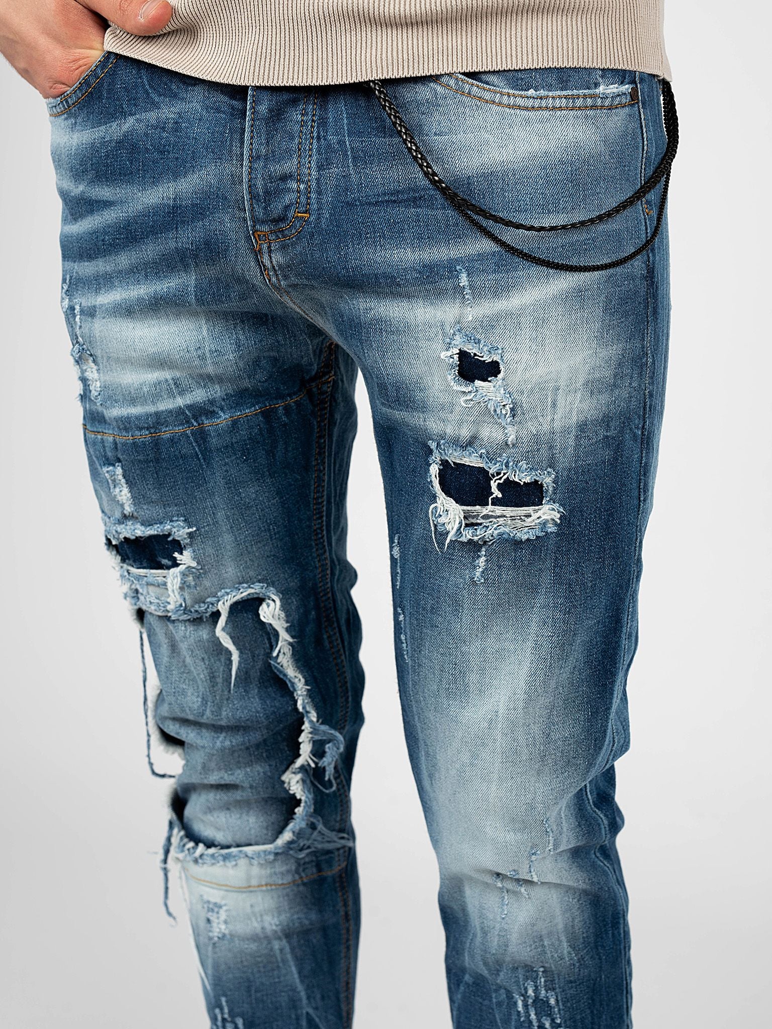 Mit Abschürfungen, Abschürfungen und Flicken an den Beinen und Taschen